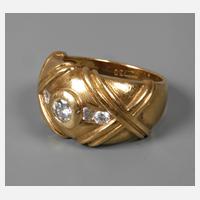 neuzeitlich, Gelbgold gestempelt 750, ca. 12 mm hoher Ringkopf, besetzt mit fünf Brillanten im Gesamtgewicht von ca. 0,25 ct, leichte Tragespuren, RW ca. 15 mm, G ca. 8,5 g.