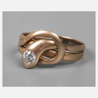 1. Hälfte 20. Jh., Gelbgold geprüft 585/1000, Ringkopf in Form einer sich windenden Schlange, besetzt mit einem Altschliffdiamanten von ca. 0,25 ct, leichte Tragespuren, RW ca. 19 mm, G ca. 4 g.