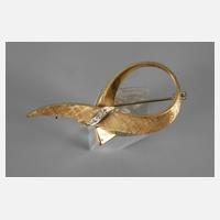 um 1970, Weiß- und Gelbgold gestempelt 750, in Form einer stilisierten Schleife mit fein satinierter Oberfläche, besetzt mit fünf Brillanten im Gesamtgewicht von ca. 0,35 ct in Krappenfassung, Altersspuren, Maße ca. 47 x 35 mm, G ca. 8,8 g.