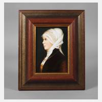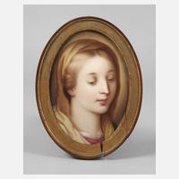 19. Jh., gepresster Buchstabe K und Nummer 8, ovale, leichte gewölbte Porzellanplatte mit feiner polychromer Aufglasurbemalung, Kopfdarstellung einer jungen Frau, ihr blondes Haar unter einem Tuch verhüllt und den Blick gesenkt, in ovaler Leiste gerahmt, diese lädiert, Motiv mit kleinem Kratzer im Ohrbereich, sonst guter Zustand, L Platte 15,5 cm, L max. 17 cm.