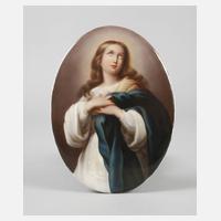 nach dem Gemälde "Maria Immaculata" von Bartolomé Esteban Murillo 1660–1665, Ausführung 19. Jh., undeutliches Prägezeichen (K 8?), altes Klebeetikett mit Bezeichnung sowie spätere handschriftliche Annotationen, leicht gewölbte ovale Porzellanplatte mit feiner polychromer Aufglasurbemalung, Halbbildnis der jungen, gen Himmel schauenden Maria in weißer Tunika und blauem Mantel, Rand rückseitig gechipt, sonst guter altersgemäßer Zustand, L ca. 17 cm.