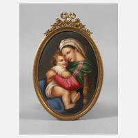 Thüringen, um 1870, ungemarkt und unsigniert, geprägte Nummer 3 und Buchstabe M, ovale, leicht gewölbte Porzellanplatte mit feiner polychromer Bemalung, gespiegelte Darstellung der sitzenden Maria mit dem Jesuskind auf dem Schoß, nach dem Gemälde von Raffaello Sanzio von 1513/14, links neben dem Ohr ein winziger Farbabplatzer und winzigste herstellungsbedingte Oberflächenirritationen, in ovalem Messingrahmen der Zeit mit Schleifenbekrönung, L Bildplatte 17 cm, L Rahmen 21 cm.