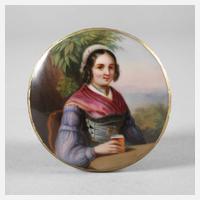 19. Jh., ungemarkt, runde, leicht gewölbte Porzellanplatte mit feiner polychromer Bemalung, Halbportrait einer jungen Frau, rastend und sich erfrischend an einem Tisch vor einem Baum sitzend, mit Fernblick auf eine Gebirgskette, Goldrand minimal gechipt, D 7 cm.