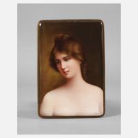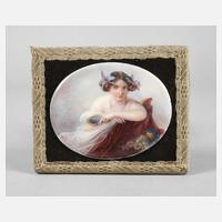 Anfang 20. Jh., leicht gewölbte querovale Porzellanplatte mit feiner polychromer Aufglasurmalerei, Halbportrait eines auf verhülltem Chaiselongue liegenden Mädchens mit entblößten Schultern und Blüten im hochgesteckten Haar, mit dem Blick den Betrachter fixierend und in der Hand einen Spiegel haltend, auf textilbespannter Trägerplatte montiert, L Bildplatte 9,5 cm.