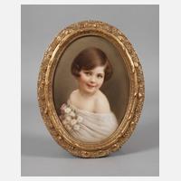 Pressmarke 1865–1920, Prägenummer 335, ovale, leicht gewölbte Porzellanplatte mit feiner polychromer Bemalung, Halbportrait eines kleinen Mädchens mit Bubikopf-Frisur, Tuchdraperie und Margeritenstrauß vor beigem Grund, rechts unten signiert H. Müller Ph.S. (Lauschaer Porzellanmaler Hermann Müller Philipp-Sohn, 1853–1936), schön in ovaler Leiste gerahmt, links neben dem Ohr etwas kratzspurig, sonst sehr guter Zustand, L Platte ca. 22,5 cm, L Rahmen 28,5 cm.