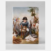 Pressmarke 1865–1920, undeutliche Prägenummer 311?, gepinselter Zusatz handgemalt sowie betitelt (etwas verwaschen), hochrechteckige Porzellanplatte mit polychromer Aufglasurbemalung, Portraitdarstellung des im Feldlager auf einem Stuhl sitzenden Napoleon Bonaparte, im Motiv signiert F. Scherf (Felix Scherf, Lauschaer Porzellanbildmaler, geboren 1954), minimal fleckiger Zustand, Maße 18 x 13 cm.
