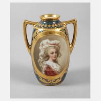 im Alt-Wiener Stil, Porzellanmalerei Richard Klemm, blaue Stempelmarke 1888-1918, ovoider Korpus mit eingezogenem Hals, zwei abgekanteten Henkeln, blauer Lüsterglasur, feiner polychromer Aufglasur- und Reliefgoldmalerei sowie Emailpunkten, in schauseitiger Ovalkartusche Darstellung der Königin Frankreichs nach dem Gemälde von Élisabeth Vigée-Lebrun (1755-1842), signiert J. Tadra, rückseitig florale Ornamentkartusche, sehr guter Zustand, H 10 cm.