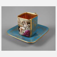 im Alt-Wiener Stil, unterglasurblaue Stempelmarke 1902–1930 der Porzellanmalerei Franz Dörfl Wien, Ritz- und Prägenummern, Pinselnummer 1558 sowie Bezeichnung, rechteckige Tassenform mit eckigem Henkel, Wandung mit dreiseitiger ornamentaler Goldreliefmalerei auf blauem Fond und schauseitiger Szene in feiner polychromer Aufglasurbemalung, Darstellung einer schlafenden Frau mit wolkenverschleiertem Kavalier und Amorknaben, Innenwandung komplett vergoldet, dazugehörige Tasse mit korrespondierendem Dekor, sehr guter Zustand, H gesamt 5,5 cm.