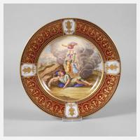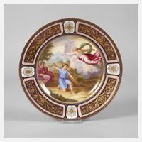 Böhmen, um 1890, unterglasurblau gepinselte Bienenkorbmarke und Prägenummer 86, glatte gemuldete Form mit feiner polychromer Aufglasur- und Reliefgoldmalerei, im Spiegel biblische Szene mit Jakobs Traum von der Himmelsleiter, die fein verzierte kartuschierte Fahne mit neoklassizistischem Dekor aus Vasen, Perlstab und vegetabilem Fries, Perlstab winzigst berieben, sonst sehr guter Zustand, D 21,5 cm.