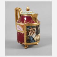 wohl Ackermann & Fritze Volkstedt-Rudolstadt, um 1910, unterglasurblaue Bindenschildmarke, zylindrische Kanne mit drei Füßchen, teils durchbrochen gearbeitetem Henkel, Knaufdeckel, feiner polychromer Aufglasur- und Reliefgoldmalerei sowie Vergoldung, kartuschierte Wandung mit schauseitiger mythologischer Szene der ruhenden Venus mit dem Amorknaben sowie umlaufende Friese und vegetabile Motive, diese teils abgegriffen und Schnaupe minimal bestoßen, H 15 cm.