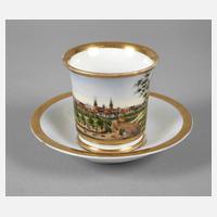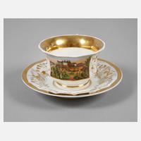 unterglasurblaue Strichmarken 1826–1951, einmal mit gepinselter Bezeichnung bzw. Präge- und Pinselnummer, Tasse in breiter zwölfkantiger Glockenform mit Standring, Spitzhenkel, schauseitiger Rechteckkartusche mit Schlossbergansicht in feiner polychromer Aufglasurbemalung, umlaufender floraler Goldmalerei und Goldrand sowie breitem Goldband innen, dazugehörige Untertasse mit gleichem Golddekor, Vergoldung minimal berieben, H gesamt 7 cm.