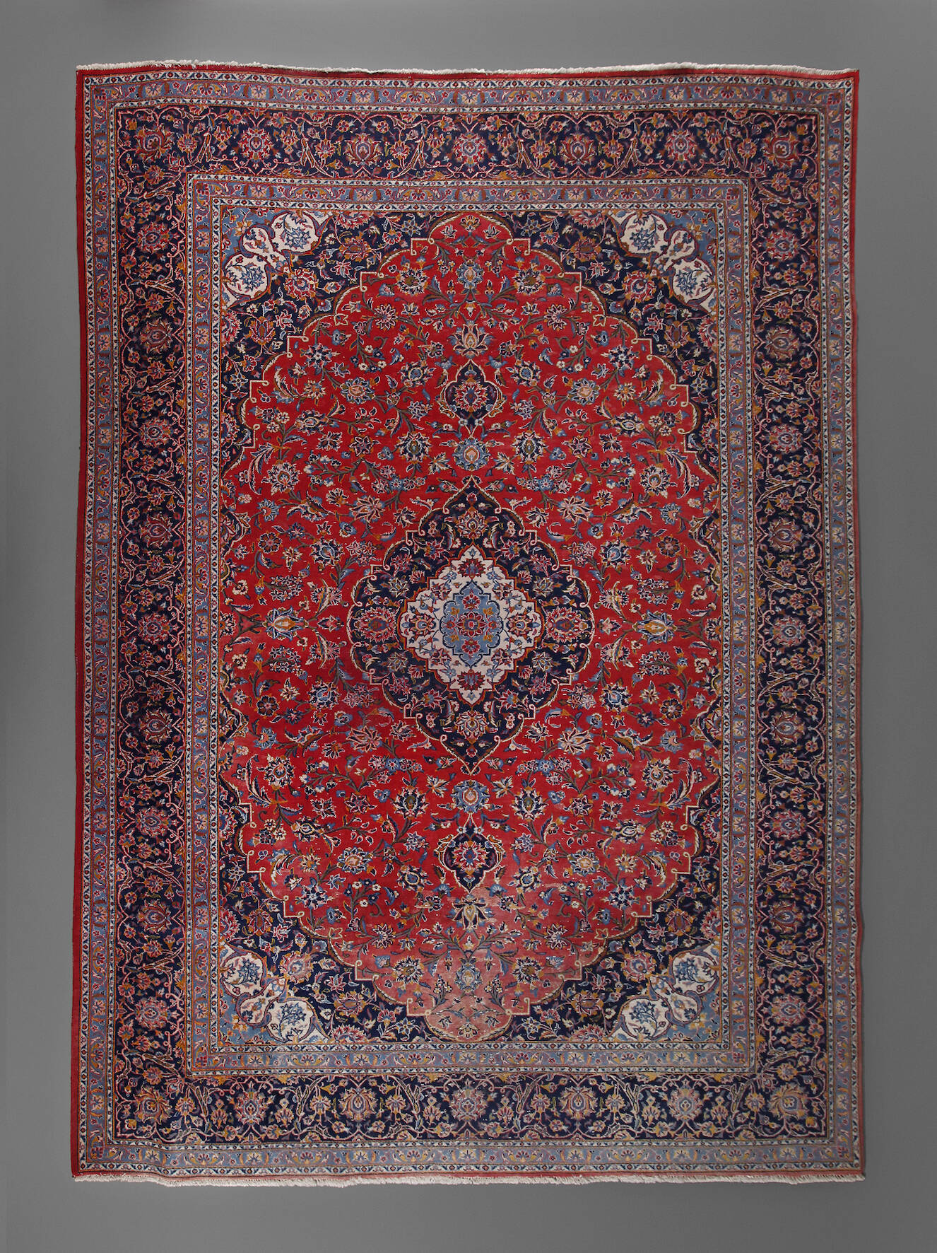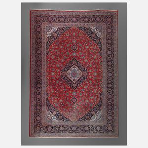 2. Hälfte 20. Jh., rückseitig mit altem Händleretikett, mehrstufig unterteiltes Mittelfeld mit luftigem Floraldekor, gerahmt von breitem Bordürenbereich, Schmalseiten gekürzt, stärkere Alters- und Ablaufspuren, Maße ca. 394 x 297 cm.
