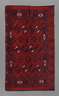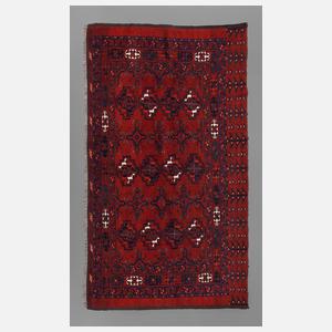 um 1900, rapportierender Rautendekor über rostrotem Fond, gerahmt von geometrisch gestalteten, mehrteiligen Bordüren, guter Zustand mit leichten Altersspuren, Maße ca. 165 x 100 cm.