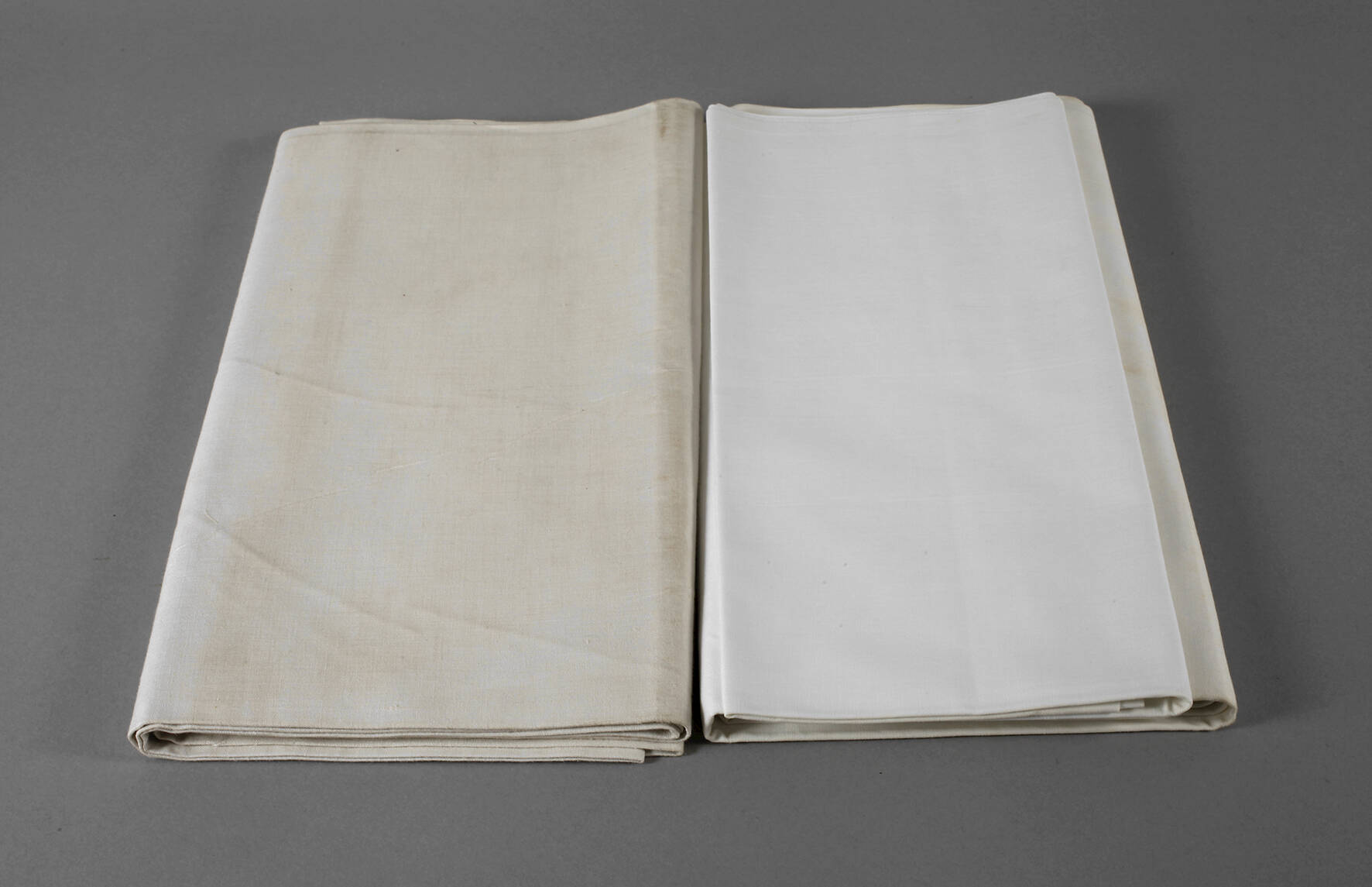 Ende 19. Jh., leicht getöntes Halbleinen, schlichte Bahnenware ohne Dekor, Lagerungsspuren, Maße je 160 x 250 cm.