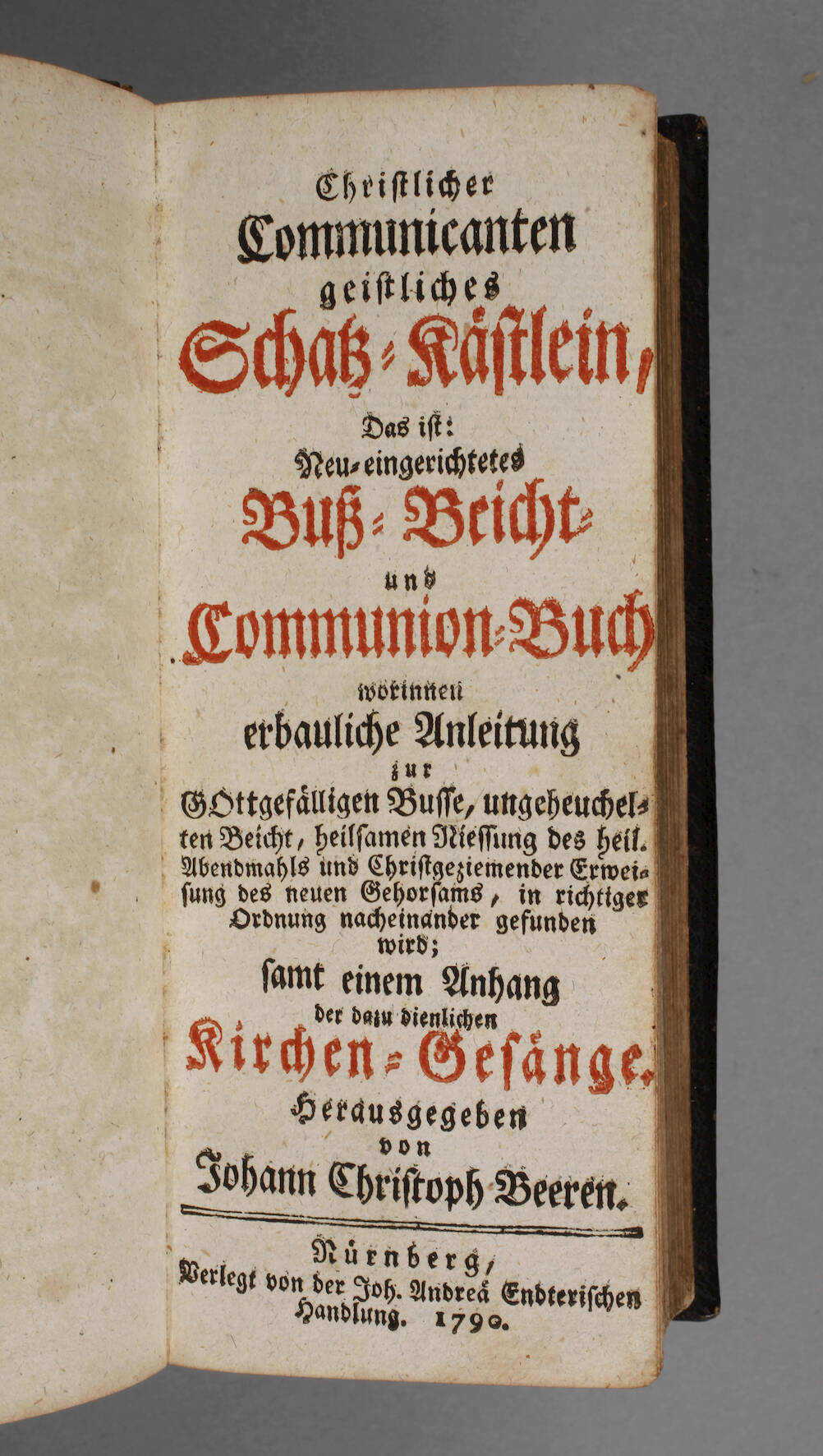 das ist: Neu-eingerichtetes Buß-Beicht- und Communion-Buch [...], hrsg. von Johann Christoph Beeren, Nürnberg 1790, Format Kl. 8°, 10 Blatt und ein doppelseitiges Vorkupfer, 627 S., Ledereinband, Goldschnitt mit Zierprägung, gute Erhaltung.