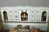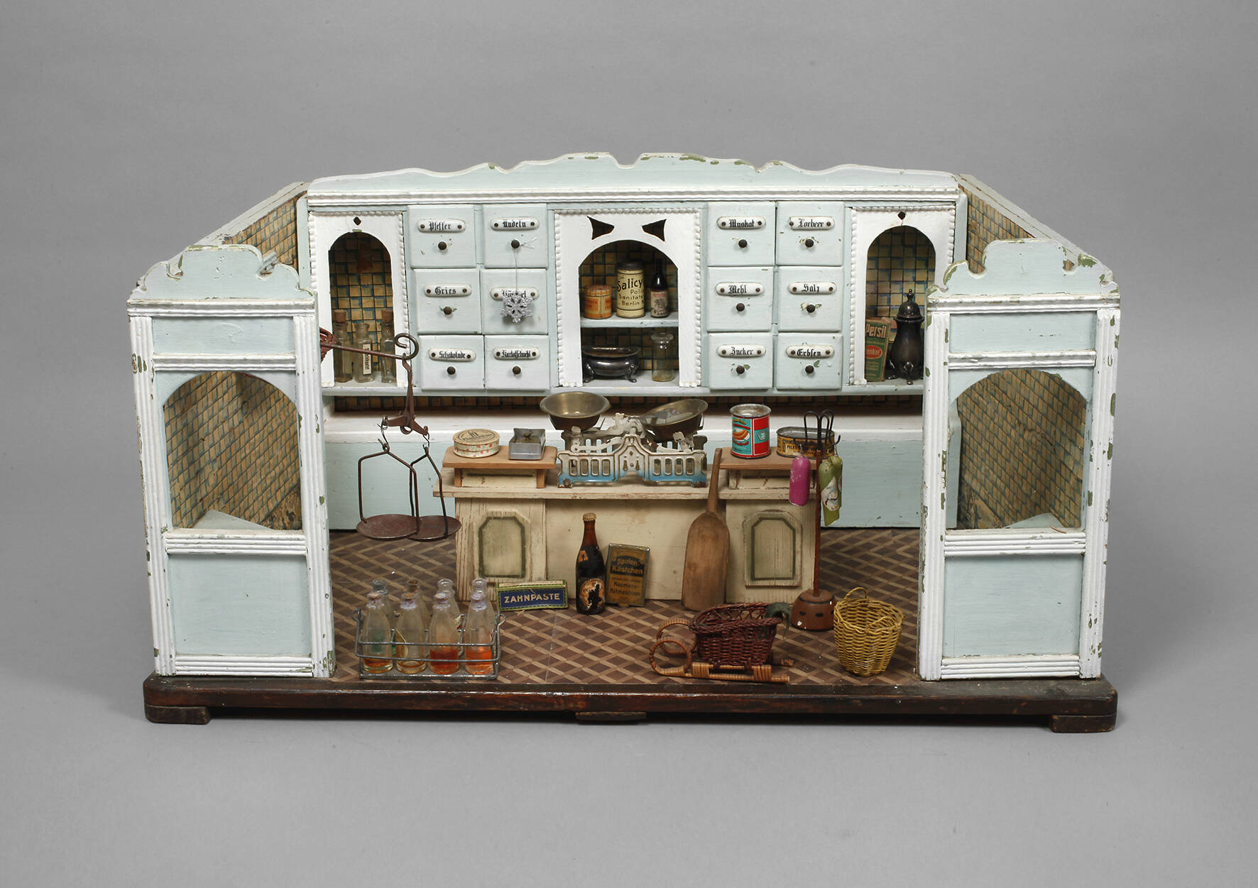 um 1910, trapezförmiges Holzgehäuse mit montierter Ladenrückwand über die gesamte Rückwand, gleichfarbigen und die Front seitlich flankierenden Schaufenstern mit Glaseinsatz sowie Wandtapete mit Figurenfries, der Schrankaufsatz mit zwölf Schüben mit Porzellanschildern und drei Nischen, dazu mobile Theke und ca. 40 Zubehörteile der Zeit aus Holz, Blech, Glas und Masse, darunter Balken- und Tischwaage, Flaschenkorb, Reklamedosen und -schachteln, Wurstständer sowie Saliere und Pfefferstreuer aus versilbertem Metall (gemarkt EPNS England), bespielter Zustand, alt übergangene Farbfassung in Mint-Weiß mit partiellen Farbabplatzern, Gehäuse etwas trocknungsrissig, Maße max. 38 x 76 x 45 cm.