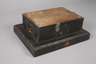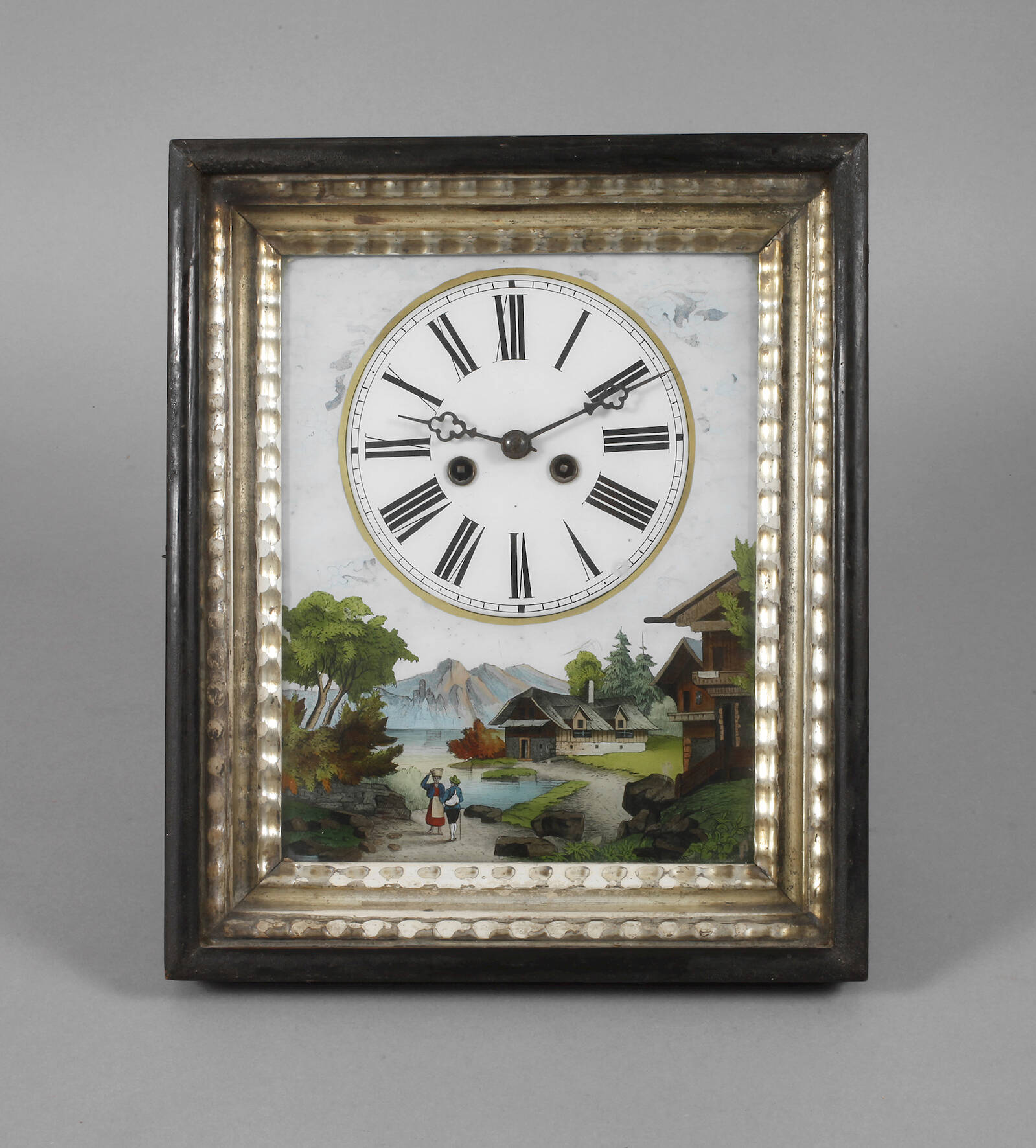 2. Hälfte 19. Jahrhundert, Glaszifferblatt mit römischen Zahlen, Motiv Bergsee mit zwei Bauernhäusern, im Vordergrund Figurenstaffage, Messingplatinenwerk mit Halbstundenschlag auf Tonspirale, Pendel mit Fadenaufhängung, funktionstüchtig, Altersspuren, mit Schlüssel, 35 x 29 x 13 cm.