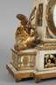 wohl Wien, um 1800, ungemarkt, cremefarben gefasstes Holzgehäuse, reich verziert mit geschnitzten und vergoldeten Applikationen, seitlich flankiert von einer Adlerfamilie, Akanthusblätter und Ornamentfriese aus vergoldetem Zinn, Werk mit drei Aufzügen und Viertelstundenschlag auf zwei Glocken (Petite Sonnerie), feines Emailzifferblatt mit arabischen Ziffern und originalen Zeigern, ein Zeiger gelötet, Werk funktionstüchtig, mit originalem Pendel und Schlüssel, Bekrönung mit kleiner Fehlstelle, Altersspuren, Höhe 45 cm.