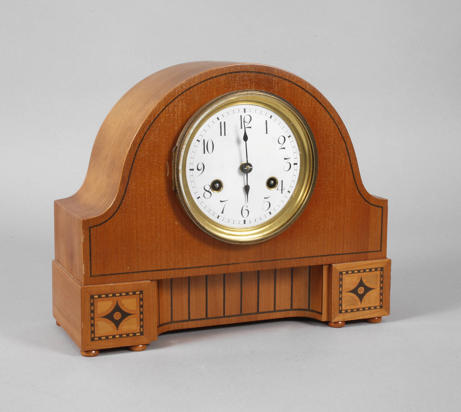 um 1910, Gehäuse im Biedermeierstil, Kirschbaum furniert, mit geometrischen Intarsien aus Ebenholz und Ahorn, makelloses Emailzifferblatt mit arabischen Zahlen, Pendulenwerk mit Halbstundenschlag auf Tonfeder, funktionstüchtig mit Schlüssel, Höhe 27 cm.