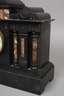 um 1900, Gehäuse aus schwarzem Marmor verziert mit Halbsäulen aus Konglomeratgestein, Pendulenwerk ohne Schlag, emaillierter Ziffernring mit arabischen Zahlen, funktionstüchtig, Gehäuse mit kleiner Fehlstelle, H 35 cm x B 45 cm x T 16 cm.