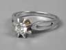 um 1970, Weißgold gestempelt 585, durchbrochen gearbeitete Ringschiene, Ringkopf besetzt mit einem Brillant von 0,45 ct und von guter Qualität in Krappenfassung, leichte Tragespuren, RW ca. 19 mm, G ca. 3,8 g.