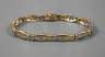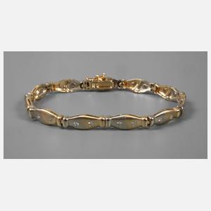 neuzeitlich, Weiß- und Gelbgold geprüft 585/1000, ca. 7 mm breite Schmuckglieder, besetzt mit insgesamt 22 Brillanten im Gesamtgewicht von ca. 0,3 ct., verdecktes Kastenschloss mit Sicherheitsacht, fein satinierte Oberfläche, L ca. 18 cm, G ca. 14,7 g.