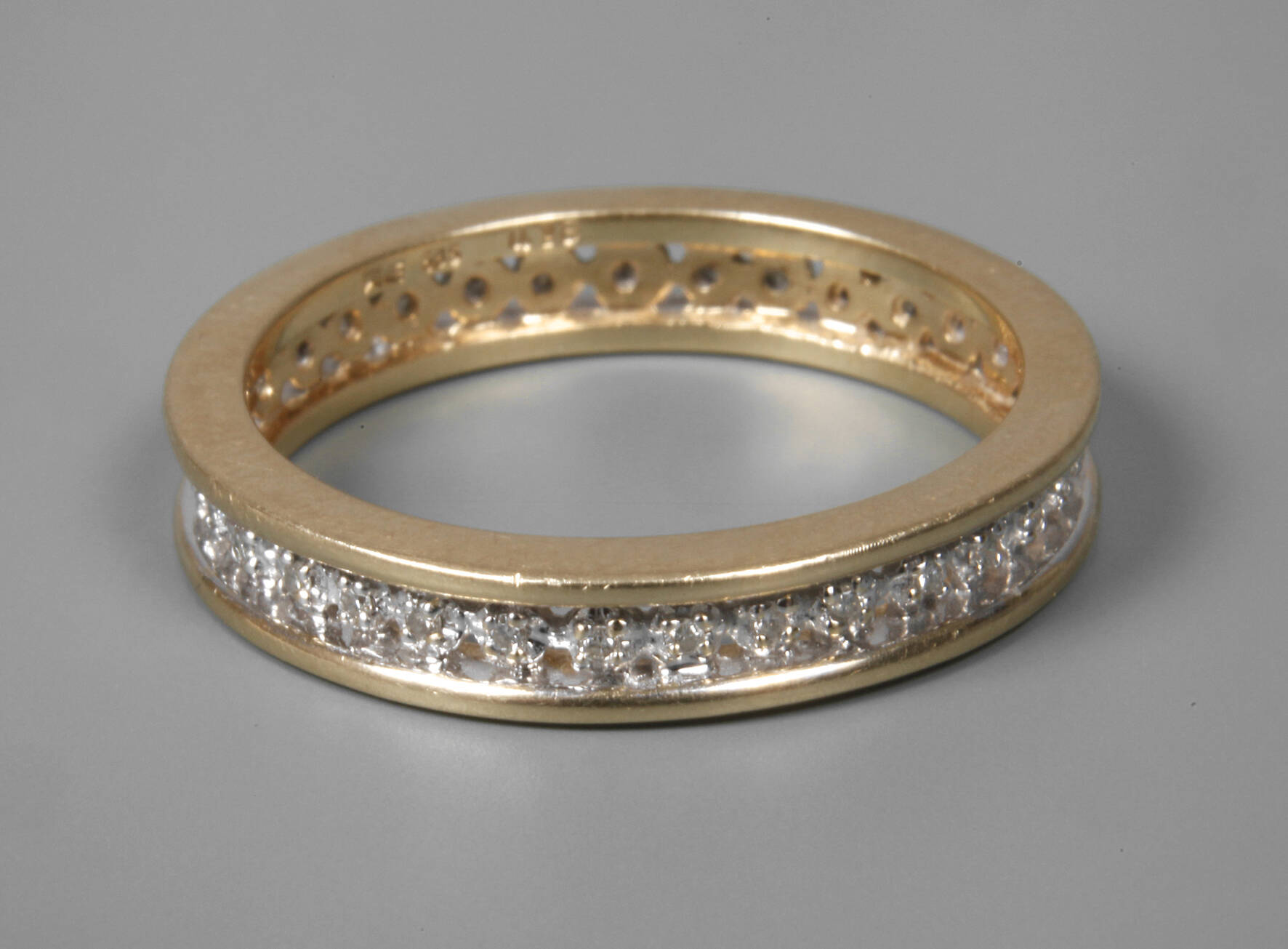 neuzeitlich, Weiß- und Gelbgold gestempelt 585, durchbrochen gearbeitet, umlaufend besetzt mit zahlreichen Kleinstbrillanten, leichte Tragespuren, RW 21 mm, G ca. 5,7 g.