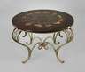 Frankreich, 1930er Jahre, rundes schmiedeeisernes Gestell, grün gefasst und goldbronziert, runde massive Glasplatte, am Rand signiert, aus massivem rubinroten Glas, hochgeätzter Dekor mit Kalender und Sternzeichen, umgeben von Wolken und Sternen, die Sternzeichensymbole vergoldet, Gestell mit Altersspuren, H 43 cm, D Platte 66 cm.