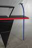 1980er Jahre, Stahl blau lackiert, MDF-Platte mit Aluminium beschichtet und schwarz eloxiert, Holz schwarz lackiert, das pyramidenförmige Mittelteil mit Klappe, darüber aufgesteckter Aufsatz (Regalboden fehlt), sonst guter Zustand, Maße 155 x 180 x 60 cm.