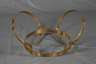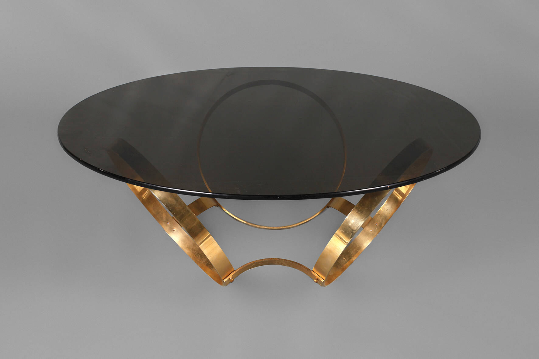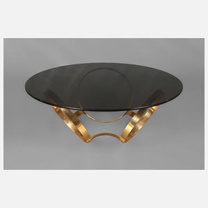 1970er Jahre, goldfarben, eloxiertes Gestell aus drei verbundenen Ringen, originale rauchquarzfarbene Glasplatte, Gestell mit leichten Korrosionsspuren, H 41 cm, D 110 cm.