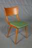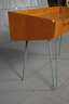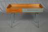 1960er Jahre, furniert, Esche partiell taubenblau lackiert, schräg ausgestellte Beine aus blau lackiertem Vierkantprofil, filigrane Messinggriffe, dazu passender Stuhl mit grünem Kunstlederbezug, Maße Schreibtisch, Maße 78 x 117 x 51 cm.