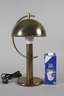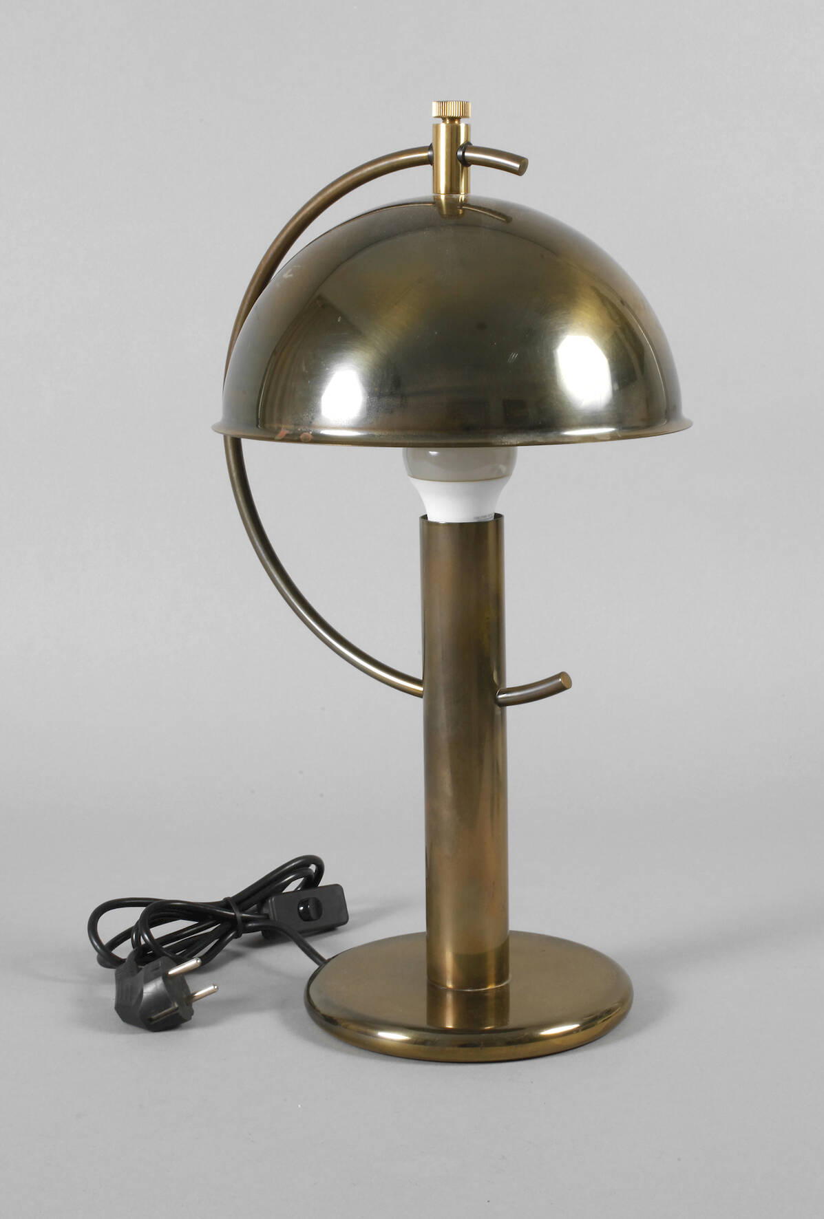 2. Hälfte 20. Jh., am Boden mit zwei originalen Klebeetiketten, Messing getrieben, flache Basis mit massivem Fuß, halbkreisförmiger Leuchterarm mit schwenkbarem Kuppelschirm, einflammig elektrifiziert, berieben, H 45 cm.