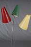 1960er Jahre, dreiflammig, mit originalen Tütenschirmen, Bespannung aus Kunststoff, rot lackierter Holzfuß, die Leuchten einzeln schaltbar, guter Zustand, H 166 cm.
