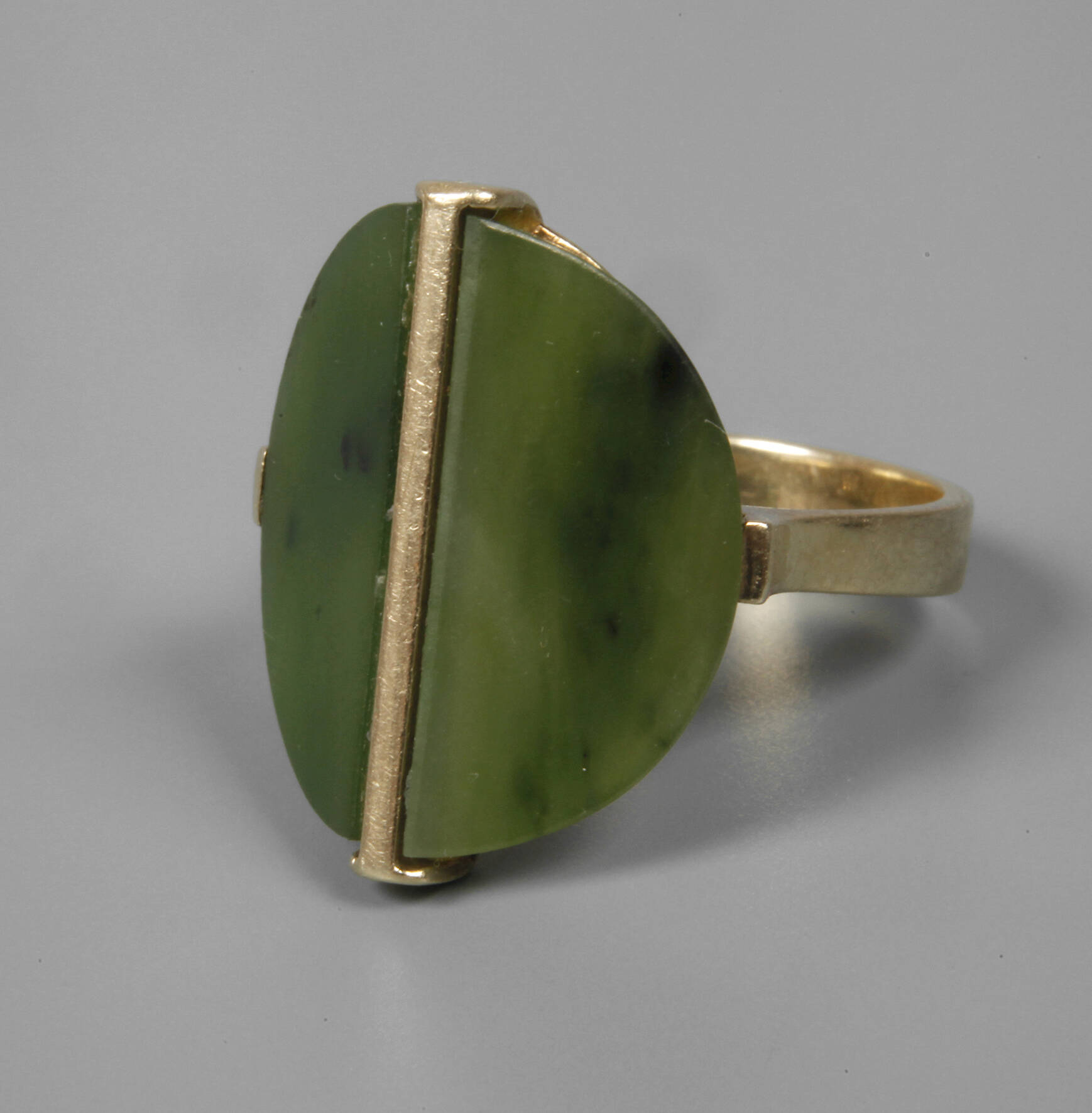 um 1970, Gelbgold gestempelt 585, ca. 21 mm hoher Ringkopf, besetzt mit zwei Jadeplatten, leichte Tragespuren, RW ca. 18 mm, G ca. 8,8 g.