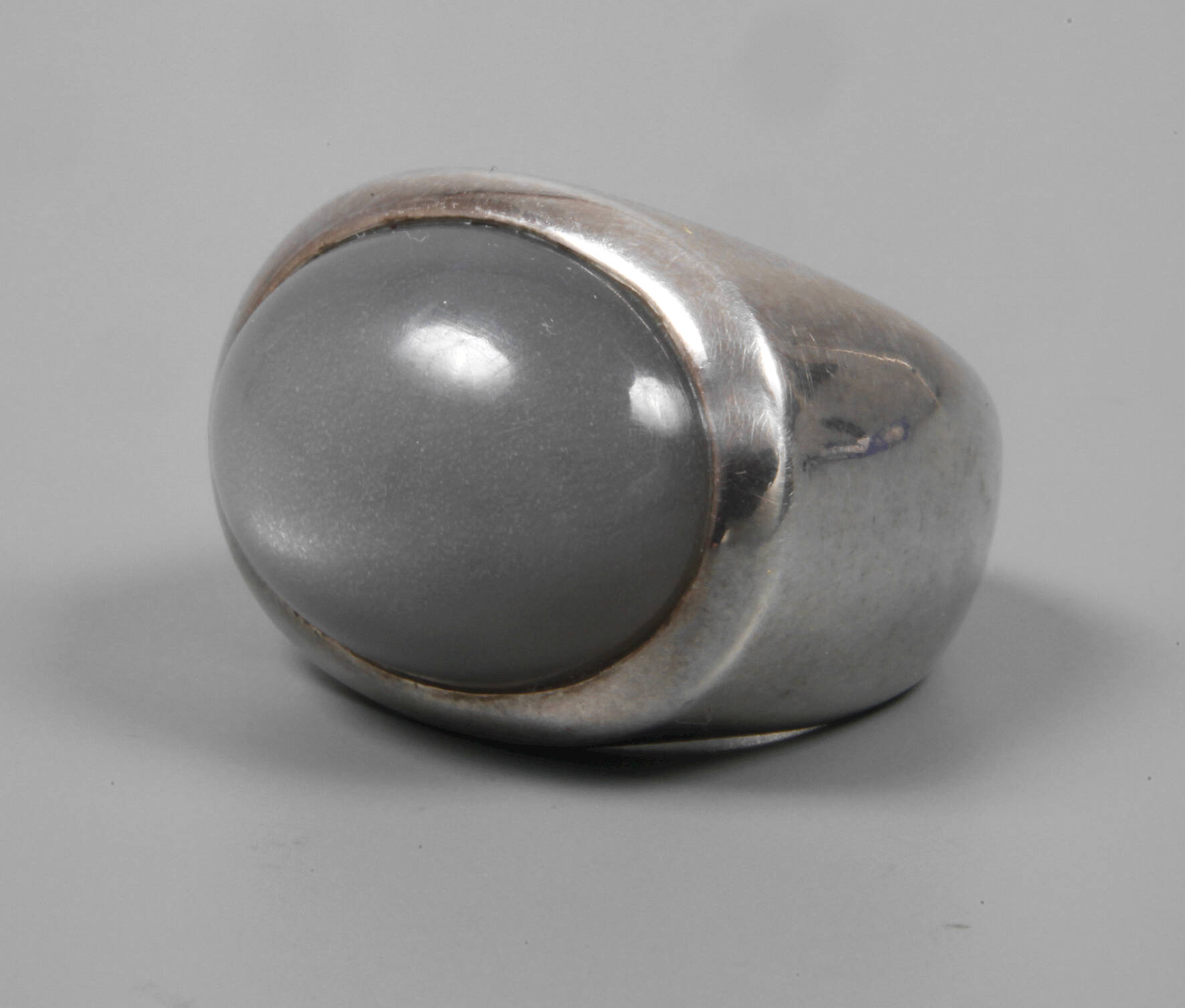 neuzeitlich, Silber gestempelt 925, ca. 18 hoher Ringkopf, besetzt mit ovalem Mondsteincabochon in Zargenfassung, leichte Tragespuren, RW 17 mm, G ca. 15,5 g.