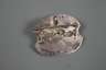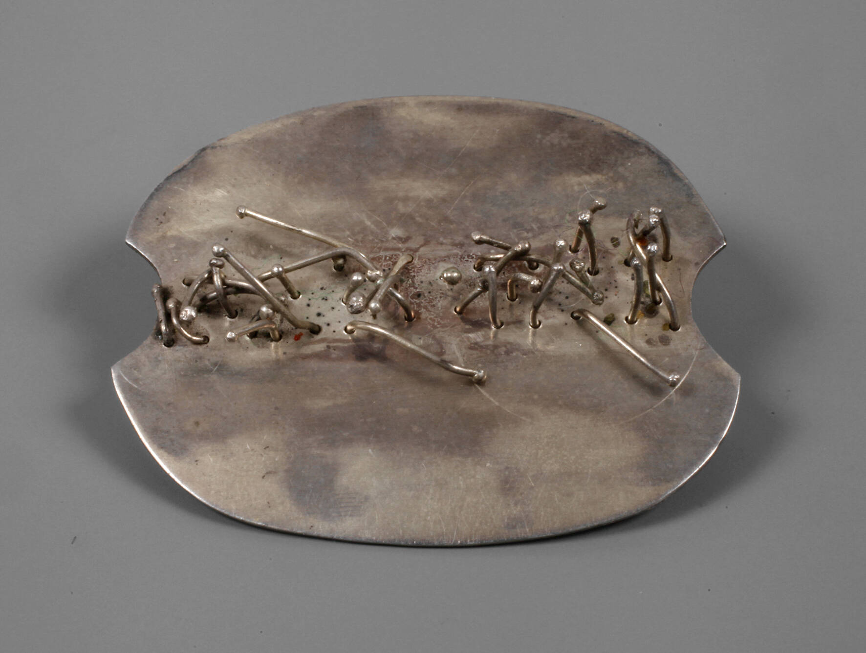 um 1980, Silber geprüft und diverse Punzen, unregelmäßige Form, durchbrochen von beweglichen Stäbchen, auch als Anhänger zu tragen, leichte Altersspuren, Maße ca. 32 x 38 mm, G ca. 8,1 g.