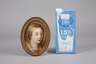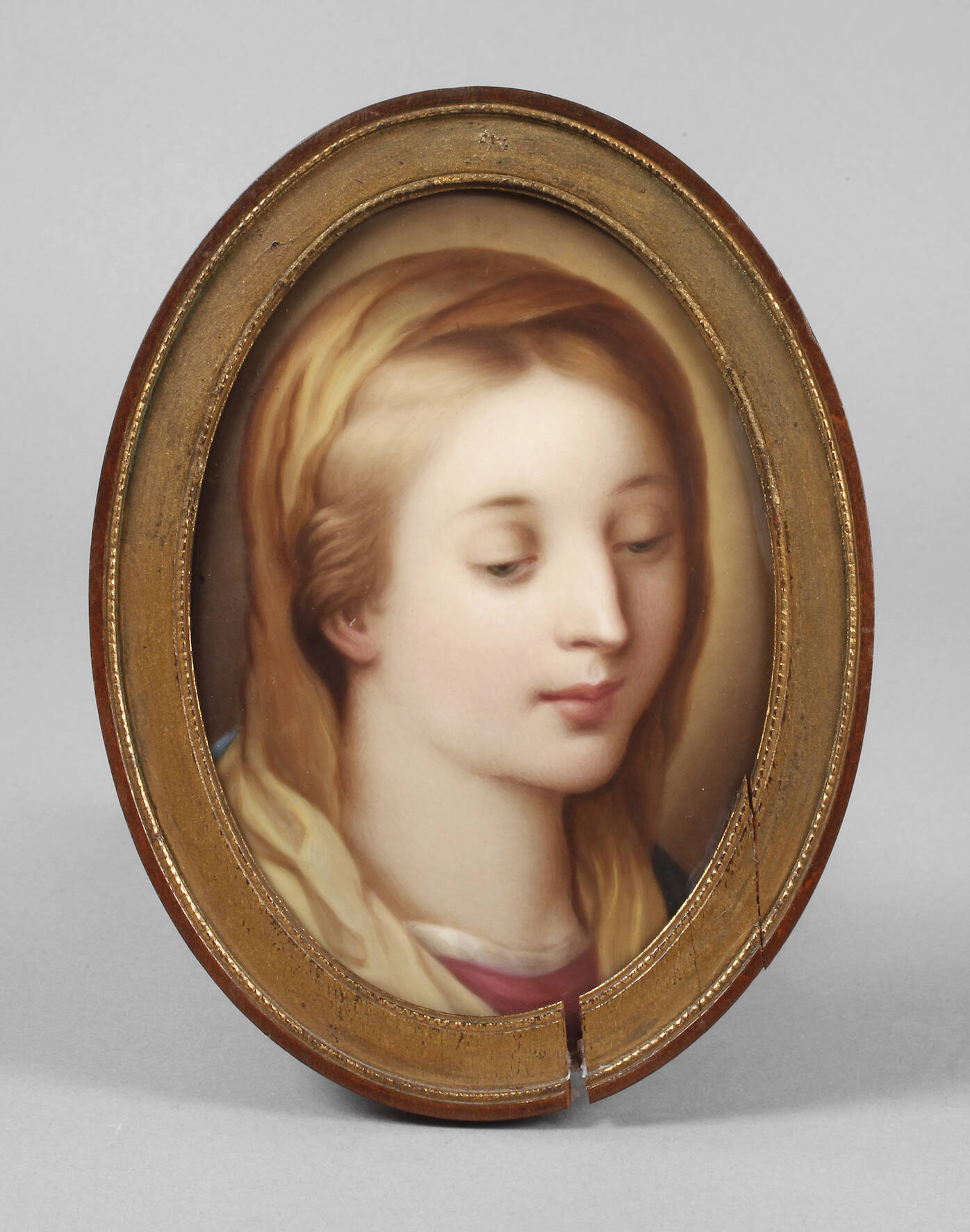 19. Jh., gepresster Buchstabe K und Nummer 8, ovale, leichte gewölbte Porzellanplatte mit feiner polychromer Aufglasurbemalung, Kopfdarstellung einer jungen Frau, ihr blondes Haar unter einem Tuch verhüllt und den Blick gesenkt, in ovaler Leiste gerahmt, diese lädiert, Motiv mit kleinem Kratzer im Ohrbereich, sonst guter Zustand, L Platte 15,5 cm, L max. 17 cm.