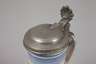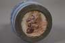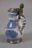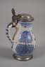 um 1750, rötlicher Fayencescherben, weißlich glasiert und mit kobaltblauer Scharffeuerfarbe bemalt, schauseitig ein architektonisches Motiv, flankiert von geschwämmelten Bäumen, übergreifender Zinndeckel mit Muscheldrücker, innen eine ungedeutete Punze, etwas haarrissig, mit winzigen Glasurfehlstellen am Lippenrand, Altersspuren, H 15 cm.