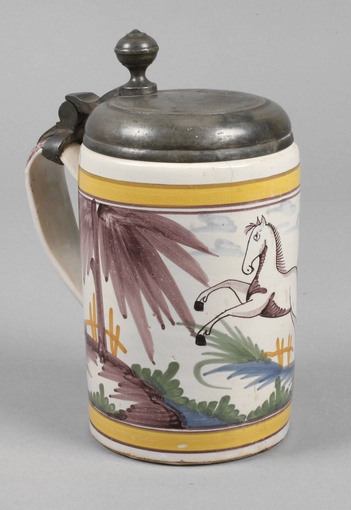 um 1800, rötlicher Scherben weiß glasiert und mit bunten Scharffeuerfarben bemalt, mit springendem Pferd in Landschaft verziert, übergreifender Deckel mit Gravur "JCEH. 1839", Haarriss am Lippenrand, H 21 cm.