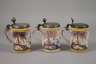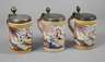 um 1800, rötlicher Fayencescherben weiß glasiert und mit bunten Scharffeuerfarben bemalt, mit springenden Pferden in Landschaft verziert, ein Deckel mit eingelegter Plakette bekröntes Hufeisen, getragen von Löwen, bez. Diepholz, ein Deckel mit Besitzermonogrammen PT.PT.BK.PT. 1857, alle restauriert, H je ca. 22 cm.