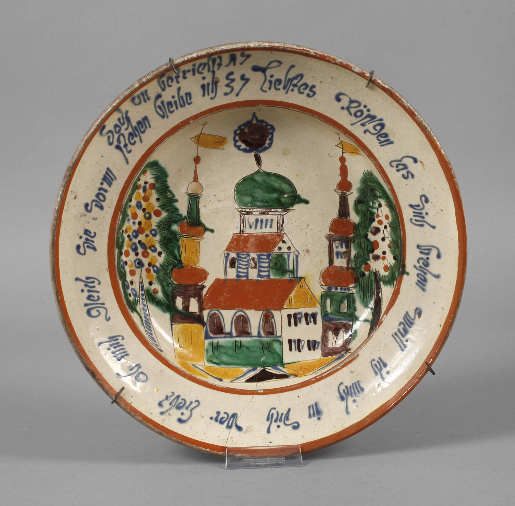 wohl Hessen, 18. Jh., Irdenware geritzt und bunt glasiert, Fahne mit umlaufendem Spruch, im Fond Kirche mit Zwiebelturm, gerahmt von zwei Bäumen, gefestigter Riss, kleinere Glasurfehlstellen, D 32 cm.
