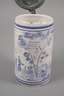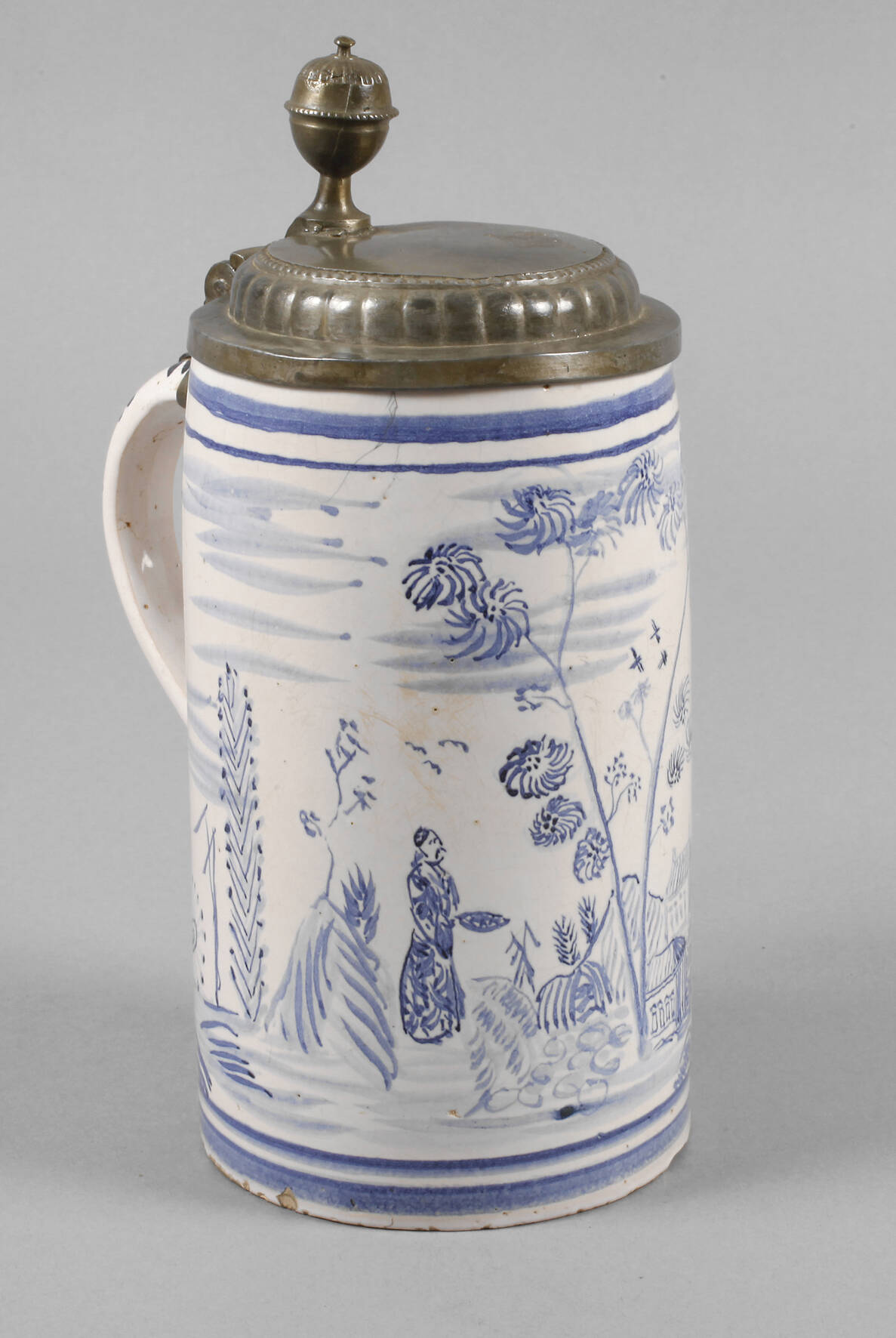 wohl um 1920, ungemarkt, heller Fayencescherben weiß glasiert und mit kobaltblauer Scharffeuerfarbe bemalt, japonisierende Szenerie mit Figur und Architekturmalerei in Landschaft, übergreifender godronierter Zinndeckel mit Kugeldrücker, Mündungsrand mit zwei Haarrissen und kleinen Fehlstellen, am Stand ebenso, H 25 cm.