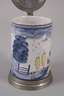 2. Hälfte 18. Jh., wohl Schrezheim oder Künersberg, Ritzmarke "Kg", rötlicher Fayencescherben weiß glasiert und mit Scharffeuerfarben bemalt, Landschaftsmalerei mit Bauernhaus, Zaun und seitlichem Schilderhaus, Zinnmontierung bestehend aus Standring und übergreifendem Deckel, dieser mit Punze als stehender Löwe, Alterscraquelé, Standring locker, H 17 cm.