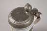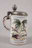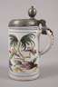 18. Jh., Pinselmarke, eventuell Erfurt, rötlicher Fayencescherben, weiß glasiert und mit bunten Scharffeuerfarben bemalt, schauseitig Darstellung einer Dame in üppigem Kleid, flankiert von Palmen und Blüten, übergreifender Zinndeckel mit Kugelrast, dieser stärker korrodiert, am Lippenrand kleine Abplatzer, sonst normale Altersspuren, H 23 cm.