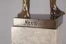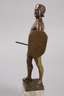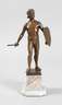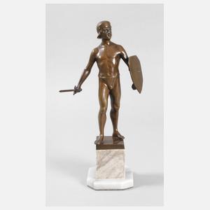 um 1925, rückseitig signiert Keck, Bronze bräunlich patiniert, vollplastische Darstellung eines athletischen jungen Mannes mit Kappe, Schild und Schwert, mit entschlossenem Blick seinem Angreifer begegnend, auf zweiteiligem hellen Marmorsockel montiert, H Bronze 25,5 cm, H ges. 33,5 cm. Künstlerinfo: deutscher Bildhauer, tätig um 1900, Quelle: Internet.