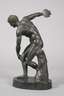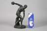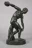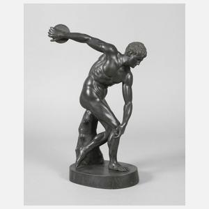 Ende 19. Jh., unsigniert, Bronze dunkel patiniert, verkleinerter Nachguss des antiken Vorbilds des ca. 450 vor Chr. entstandenen Diskuswerfers von Myron, an einem Felsvorsprung stehender nackter Athlet, kraftvoll zum Diskuswurf ausholend, auf ovaler Plinthe, minimal berieben, H ca. 37,5 cm.