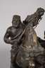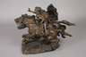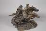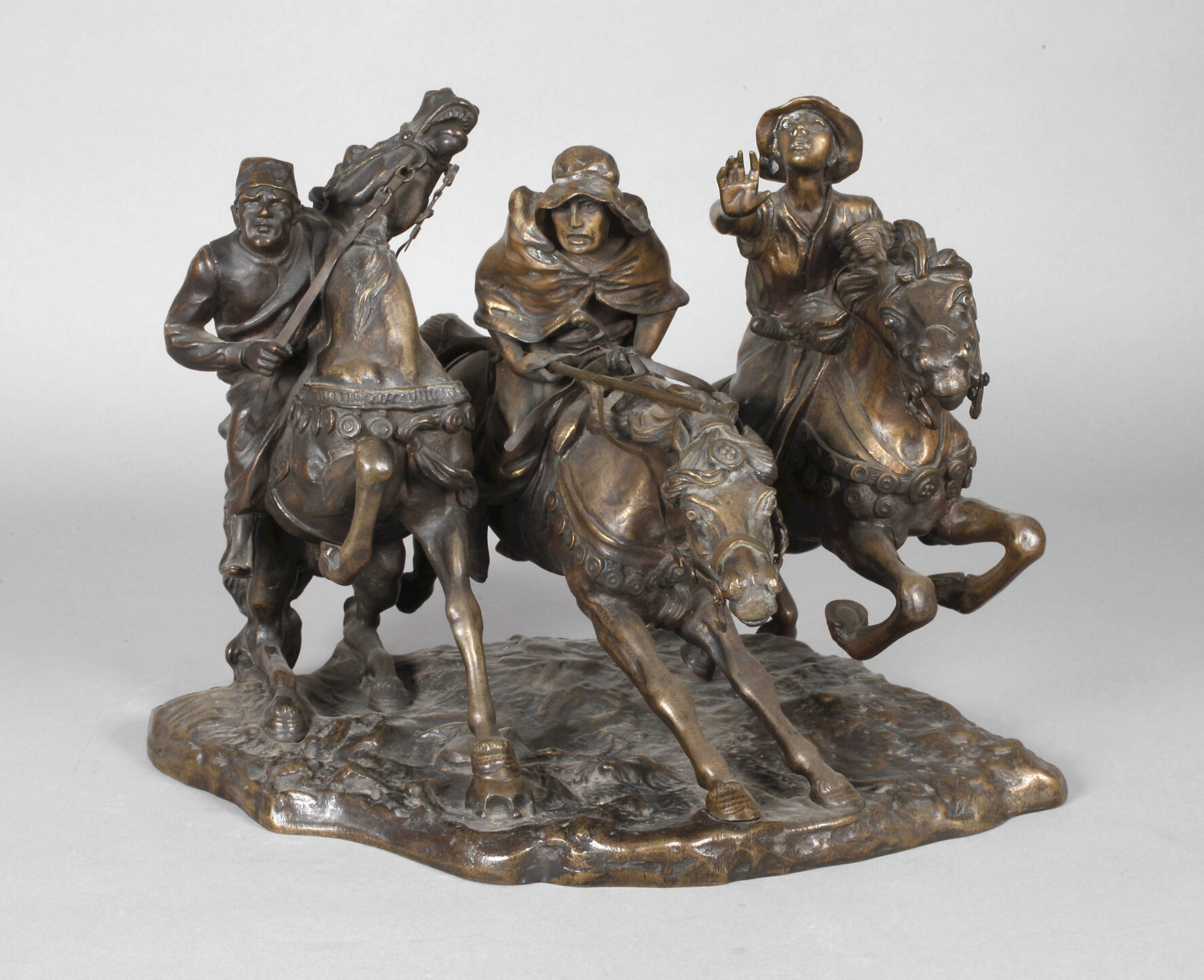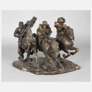 Ende 19. Jh., an der Plinthe signiert A. Pandiani Milano, Bronze, mehrteilig gefertigt und montiert, dunkelbraun patiniert, überaus bewegte Darstellung dreier wilder Reiter im Galopp, auf naturalistisch gestalteter Plinthe montiert, leichte Altersspuren, Maße ca. 32 x 42 x 39 cm. Künstlerinfo: italienischer Bildhauer (1838–1928), Quelle: Internet.