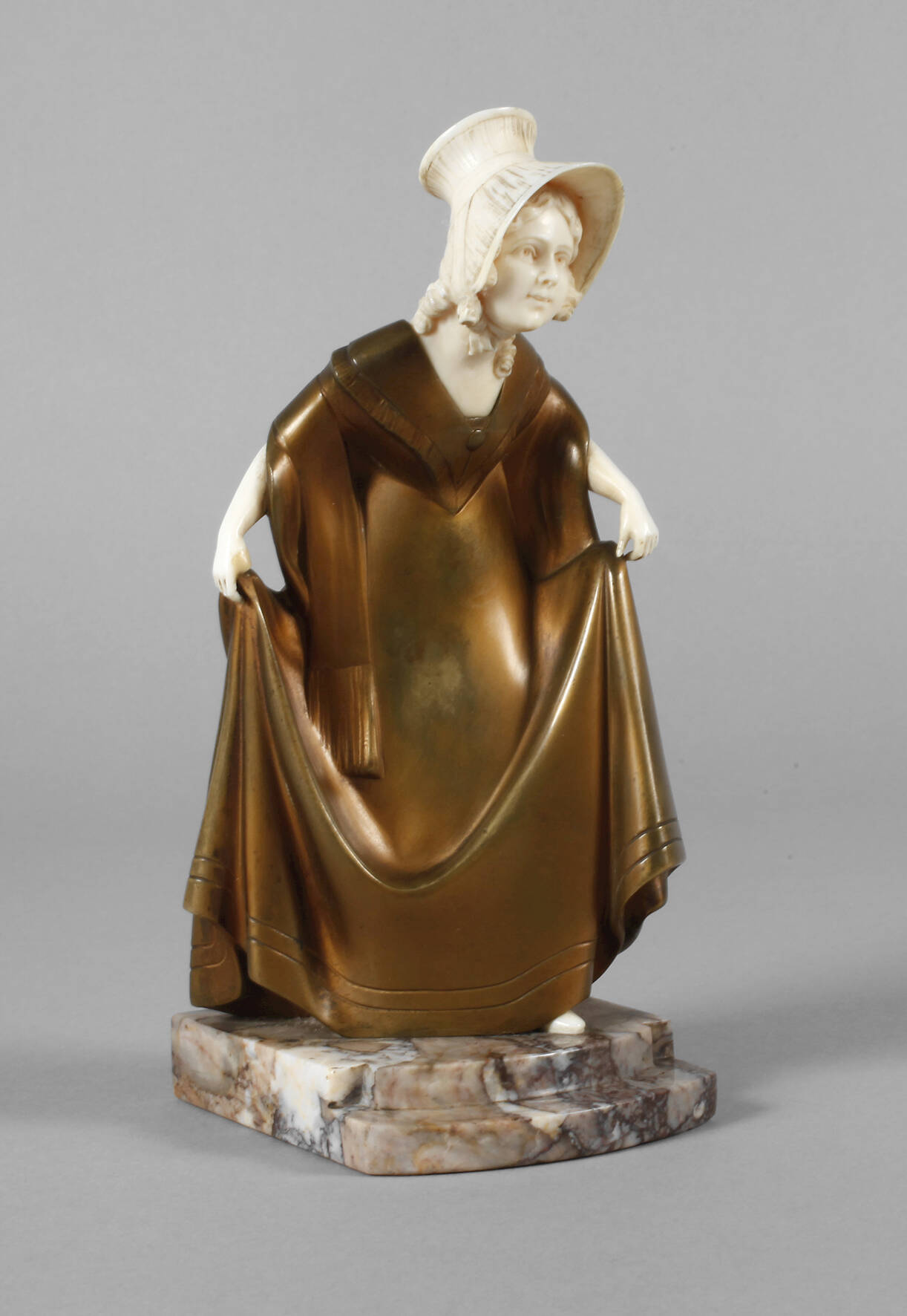 um 1915, rückseitig signiert Peleschka-Lunard sowie zusätzliches Signet RuM, Bronze leicht patiniert und Elfenbein qualitätvoll beschnitzt, in biedermeierlicher Manier dargestelltes junges Mädchen mit Korkenzieherlöckchen und Hut, ehrfürchtig knicksend und den Rock raffend, auf getrepptem, fein geädertem Steinsockel, ein Finger fehlt, etwas berieben, H Bronze ca. 20,5 cm, H gesamt ca. 23 cm. Künstlerinfo: österreichischer Bildhauer (1873 Wien bis ?), studierte an der Akademie der Bildenden Künste in Wien unter Edmund Hellmer, zeitweise tätig in Berlin, fertigte besonders Werke aus Alabaster, Bronze und Elfenbein im Stil des Art déco, Quelle: Internet.