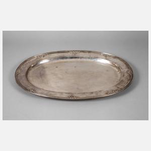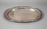 nach 1875, gestempelt Stadtmarke, Meistermarke Sassikov und Beschaumeistermarke sowie 84 Zolotniki, schweres ovales Tablett, die Fahne mit aufgelötetem ornamentalen Dekor, zweifach graviertes Besitzermonogramm, guter Zustand, L 58 x 41 cm, G ca. 2560 g.