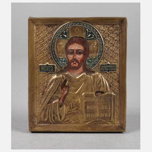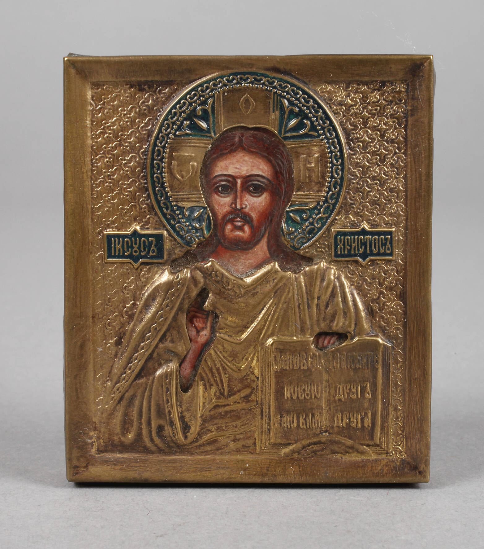 20. Jh., kirchenslawisch bezeichnet, Tempera auf Laubholz, fein geprägtes Messingoklad, teils dunkel emailliert, Darstellung Christus Pantokrator mit Evangelienbuch und zum Segensgestus erhobener Hand, Maße 7 x 6 cm.